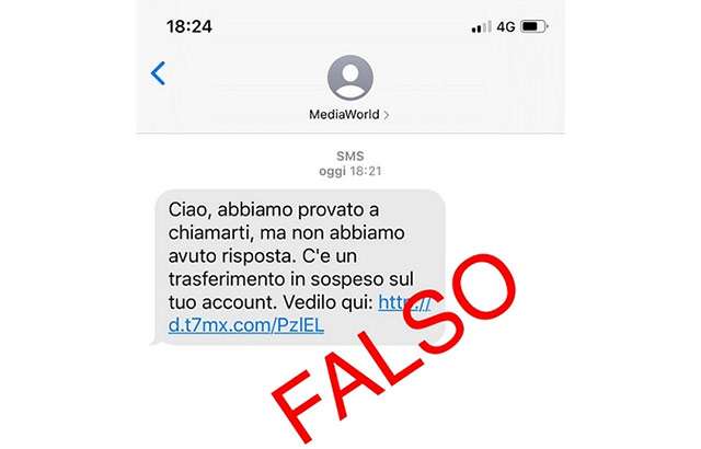 Questa volta il tentativo di carpire illecitamente informazioni personali e dati di carte di credito o di accesso a servizi on line, arriva da un SMS apparentemente da MediaWorld, il quale ci invita a cliccare un link per controllare un “presunto trasferimento in sospeso sull’account”.