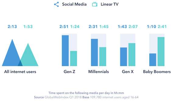 La loro centralità è testimoniata da uno studio condotto da GlobalWebIndex nel Q1 2018 su un campione composto da 109.780 utenti Internet di età compresa tra 16 e 64 anni, a livello globale. L’unico paese escluso dallo studio è la Cina, per via delle limitazioni imposte agli utenti in termini di libero accesso al Web. Ne emerge un dato interessante: in media ciascuno di noi trascorre 20 minuti in più al giorno interagendo con i social rispetto a quanti dedicati alla TV . Quella tradizionale, non i vari servizi di streaming come Netflix e Youtube, nei quali la componente social è comunque presente. Nel dettaglio 2 ore e 13 minuti sulle piattaforme online, 1 ora e 53 minuti davanti al piccolo schermo. Il divario si fa più ampio se si prendono in considerazione esclusivamente i target più giovani. Con la Generazione Z – quella nata dalla seconda metà degli anni ’90 in poi – la forbice sale a 87 minuti.