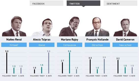In generale , Matteo Renzi è il più popolare su Twitter (grazie ai suoi 2.177.652 al 31 dicembre 2015) e Merkel, che non ha un account sulla piattaforma di microblogging, è quella con più amici su Facebook. Alexis Tsipras è invece quello che riesce a raccogliere maggiormente seguaci anche all’estero, anche perché è l’unico ad avere profili internazionali sui social oltre a quelli in greco, mentre lo spagnolo Mariano Rojoy è il più attivo. Meno bene fanno invece sia François Hollande che David Cameron, definiti troppo istituzionali e per questo non capaci a creare engagement con la loro community.