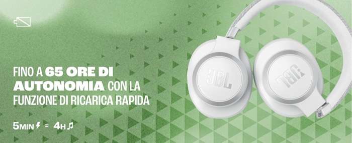 Con un’autonomia di 65 ore e il supporto alla ricarica rapida (che ripristina la batteria in sole 2 ore), puoi avere sempre con te le cuffie over-ear JBL Live 770NC e vivere in ogni occasione la migliore esperienza audio possibile.