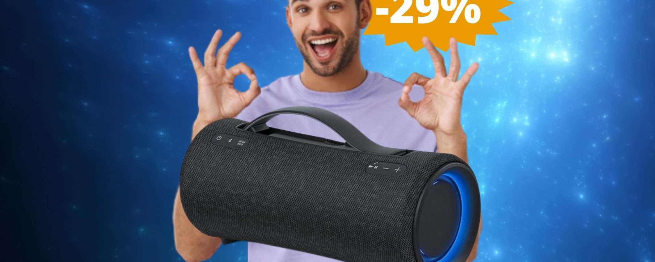 Ma non è solo la resistenza a rendere questo speaker così speciale. Grazie agli speaker X-Balanced, ai tweeter e ai radiatori passivi, offre un suono potente e dettagliato che trasformerà ogni brano in un’esperienza coinvolgente. E quando arriva il momento di festeggiare, l’illuminazione multicolore sui radiatori passivi si sincronizzerà con il ritmo della tua musica, creando un’atmosfera unica che renderà ogni festa indimenticabile.