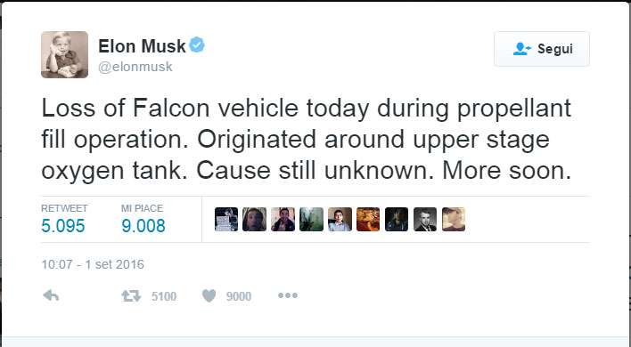 Non tutte le ciambelle riescono col buco, recita il proverbio. Capita pertanto di assistere all’impensabile, ovvero che il Falcon 9 di SpaceX, lo stesso vettore capace di atterrare in verticale senza riportare danni irrimediabili permettendo un notevole risparmio in termini di costi e di tempi, finisca poi per fallire il decollo. Così durante un test dei motori, a Cape Canaveral in Florida, una terribile esplosione cancella il lancio del vettore, senza pilota, programmato per sabato. Elon Musk, CEO di SpaceX, ha twittato sul proprio account che l’esplosione è avvenuta durante “un’operazione di carico del propellente”, in prossimità del serbatoio di ossigeno dello stadio superiore del razzo. Sull’account Twitter di SpaceX è stato poi aggiunto che l’incidente non ha provocato feriti.