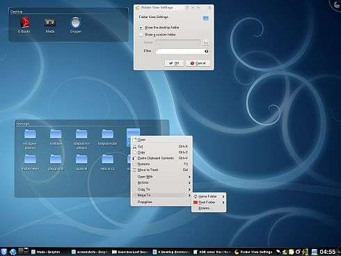 La dipartita del supporto alle icone è stata in qualche modo bilanciata dall’introduzione di un nuovo widget, Folder View , che consente di visualizzare sul desktop, senza l’ingombrante interfaccia del file manager Dolphin, il contenuto di qualsiasi cartella, inclusa quella Desktop : massimizzando le dimensioni di tale finestra, e sfruttando il supporto alle trasparenze di Plasma, è possibile simulare il buon vecchio desktop a icone. Ma le funzionalità, secondo gli sviluppatori, sono ora ben maggiori: tra queste, la possibilità di filtrare i tipi di file, vedere cartelle remote, cancellare e copiare file, aprire contemporaneamente più viewer di cartelle.