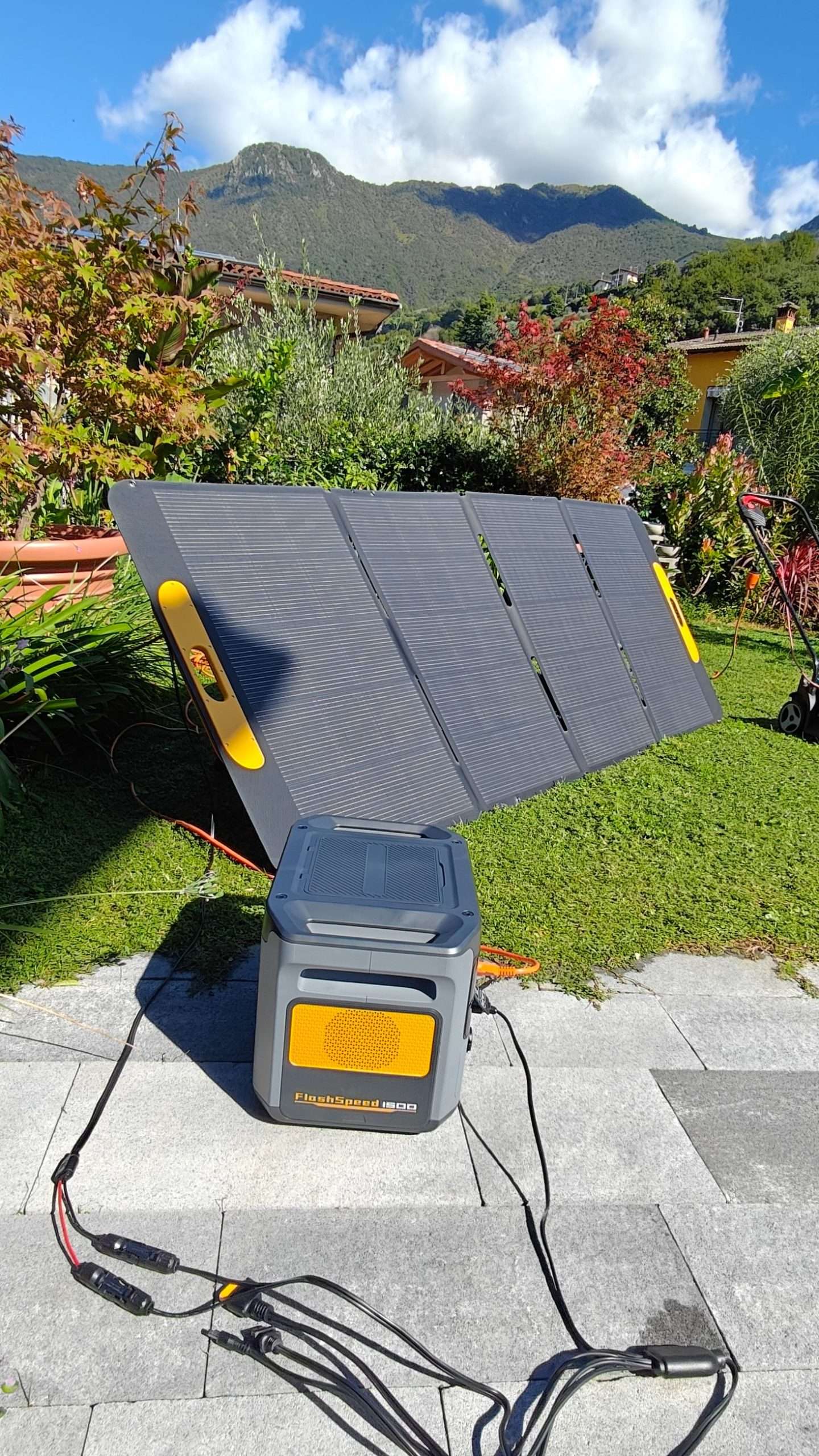 Il modello FlashSpeed 1500 è dotato di batterie al litio-ferro-fosfato (LiFePO4), per una capacità totale di 1548 Wh lordi. Può erogare energia elettrica ad una potenza massima di 1500 Watt (3000 Watt di picco, per brevi periodi) e può ricaricarsi sia dalla normale presa elettrica di casa a 1500 Watt, da un ingresso a corrente continua a 12V/10A (120 Watt massimi), o da pannelli solari da 200 o 400 Watt tramite connettore Anderson. Chiaramente, la ricarica rapida la si ottiene tramite alimentazione da rete domestica: appena un’ora.