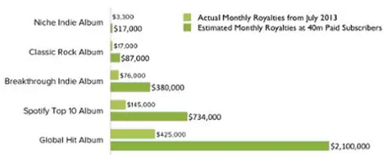Attraverso questo sistema Spotify, grazie a 24milioni di utenti attivi e quasi 6milioni di paganti, finisce per pagare al mese 3.300 dollari per un album indipendente di nicchia e 425mila dollari per una hit mondiale. Questo equivale a una cifra che in media si aggira tra i 6mila e gli 8.400 dollari ogni milione di ascolti , contro i circa 3mila che offre un servizio di video streaming come YouTube o i 1.300-1.500 di uno streaming radio come Pandora.