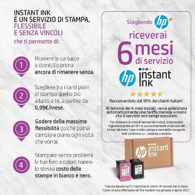 Disponibilità immediata e spedizione Prime ti permetteranno di riceverla a casa molto presto e in più hai anche 6 mesi di Instant Ink Inclusi che ti daranno modo di avere delle cartucce di ricambio a casa senza costi aggiuntivi.