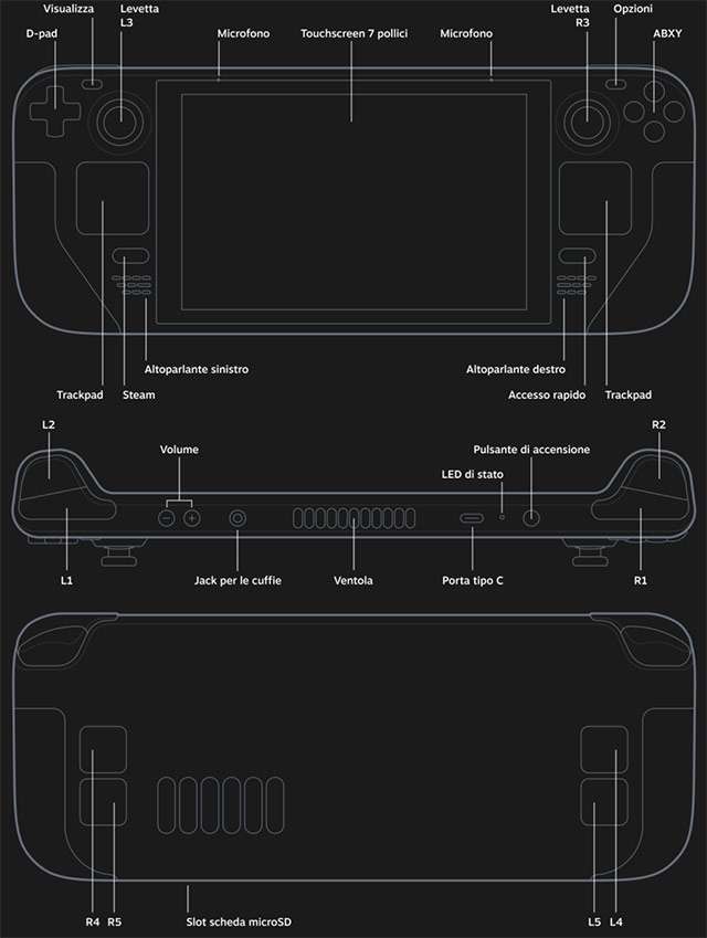 Lato software, il sistema operativo è una nuova versione di SteamOS (la 3.0), creata appositamente per il dispositivo. Qui sotto un’immagine che mostra tutti i controlli e le porte di connessione presenti.