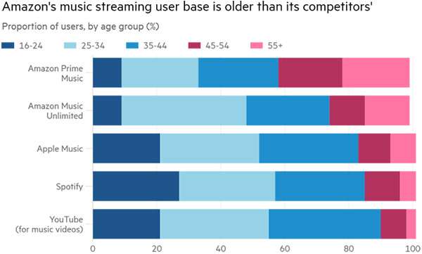 A innescare il trend di crescita anche la scelta di rivolgersi a un target sul quale i competitor non si sono concentrati: Music Unlimited è la piattaforma preferita dall’utenza adulta. Facciamo riferimento al grafico riportato di seguito, pubblicato dal Financial Times, per capire come nelle fasce d’età 45-54 anni e 55+ quello di Amazon sia il servizio più diffuso almeno negli Stati Uniti. Tra i giovanissimi (16-24 anni) domina invece Spotify.