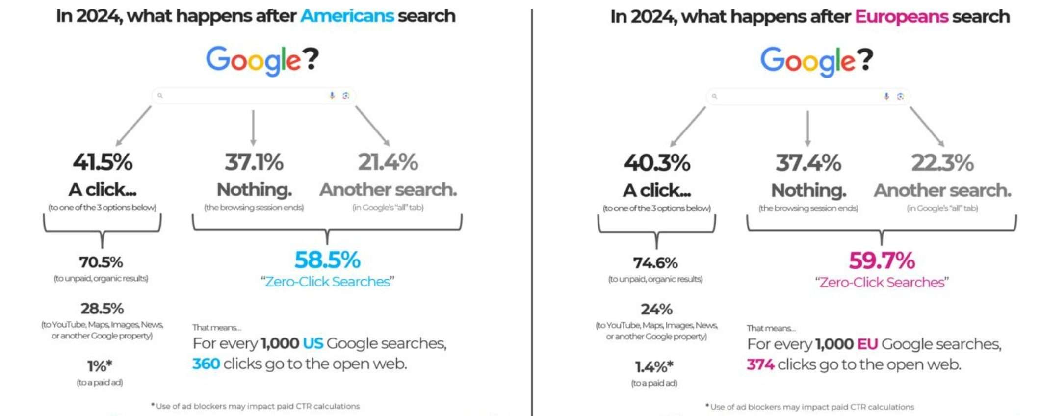 L’esperto ha cercato di capire il comportamento degli utenti sui motori di ricerca, le differenze tra Europa e Stati Uniti e l’impatto delle famose AI Overview di Big G, alias le panoramiche AI, quelle della colla sulla pizza, per intenderci. Per realizzare il suo studio, Rand Fishkin ha utilizzato i dati forniti da Datos, una società di SEMrush.