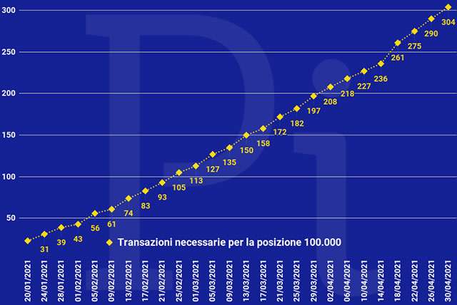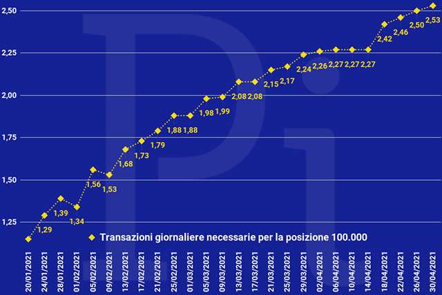 Avendo ora a disposizione i dati completi di aprile, possiamo fotografare come è andato via via crescendo il volume delle transazioni minime per la posizione 100.000 in questi quattro mesi.