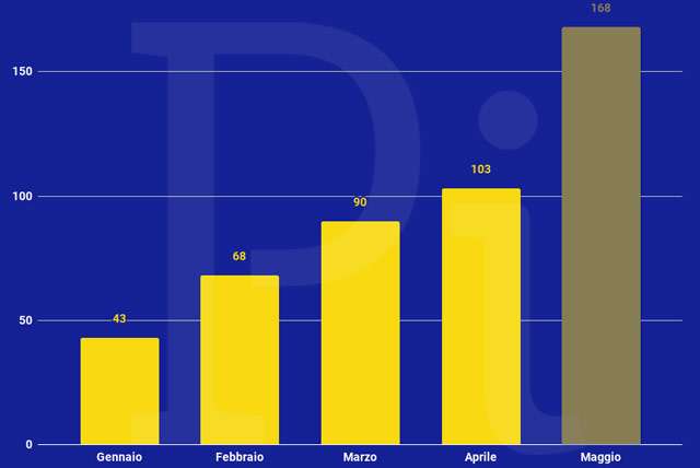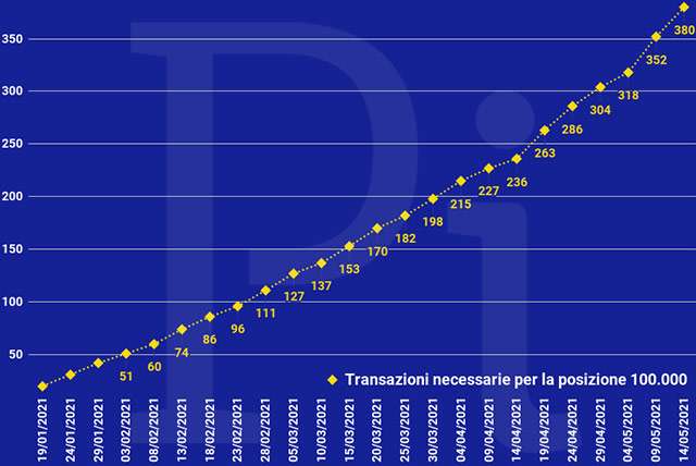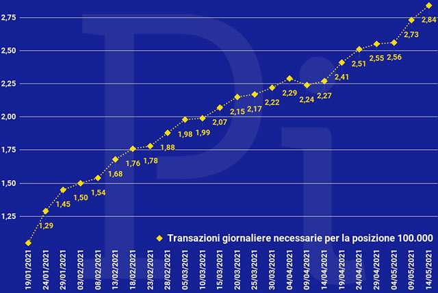 La frequenza è andata aumentando in modo progressivo. Il grafico qui sotto mette in evidenza il trend al rialzo per quanto riguarda il volume delle transazioni generate da chi, mese per mese, si è classificato alla posizione 100.000. La colonna relativa a maggio rappresenta ovviamente una stima.