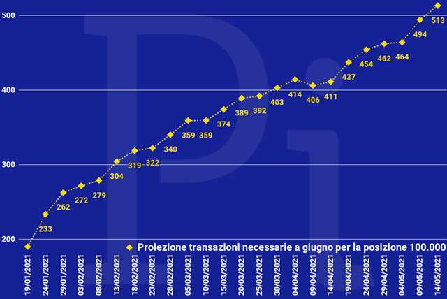 Sempre valutando l’intera durata dell’iniziativa, la previsione a fine giugno dice che saranno necessarie almeno 513 movimenti per mettersi in tasca il Super Cashback. Non ci stupirà assistere a un ennesimo rialzo da qui in avanti.