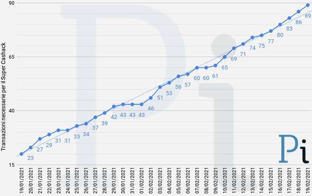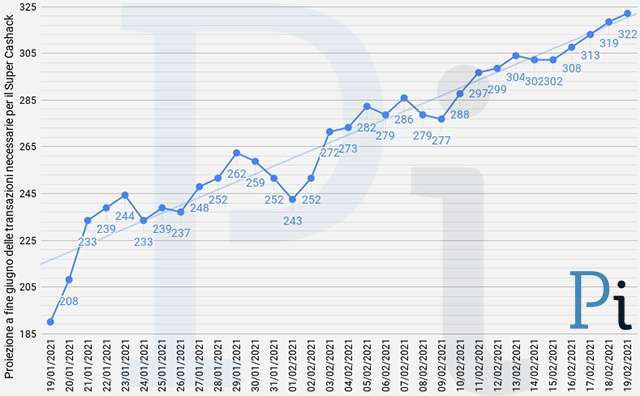 Ad oggi, venerdì 19 febbraio, sono necessari 89 pagamenti per risultare temporaneamente alla posizione 100.000. In altre parole 1,78 ogni giorno oppure 12,46 alla settimana. Di seguito il grafico che mostra come è variato il numero nel corso dell’ultimo mese.