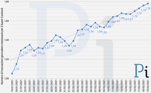 Prosegue dunque il trend di crescita registrato ormai da qualche settimana a questa parte, come testimonia l’immagine qui sotto. Guardando indietro erano 1,32 su base quotidiana il 25 gennaio, 1,38 il 28 gennaio, 1,51 il 4 febbraio, 1,54 l’8 febbraio, 1,65 il 12 febbraio e 1,70 il 16 febbraio.