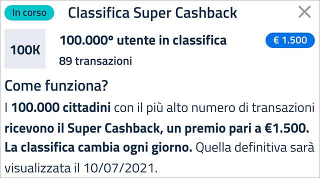 I 1.500 euro del Super Cashback saranno versati sul conto corrente degli aventi diritto all’IBAN da loro indicato, insieme al rimborso del 10% sulle spese effettuate (fino a un massimo di 150 euro) durante l’intero semestre.