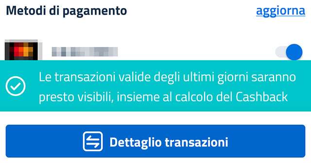 Le transazioni valide degli ultimi giorni saranno presto visibili, insieme al calcolo del Cashback.