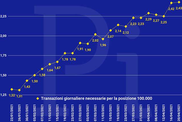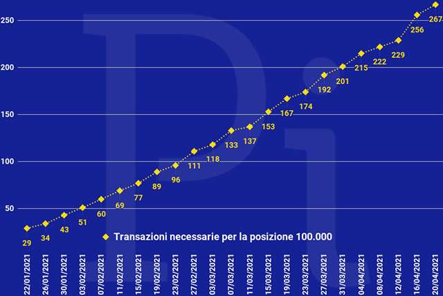 Nel momento in cui viene scritto e pubblicato questo articolo è necessario aver eseguito 267 transazioni per posizionarsi in modo temporaneo sul gradino 100.000, l’ultimo di quelli utili per l’ottenimento del premio. Il grafico qui sotto mostra la variazione registrata da gennaio in poi.