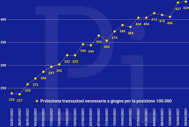 Volendosi cimentare in una previsione a fine giugno, stando ai dati odierni, ne serviranno almeno 439 per ambire all’ottenimento del Super Cashback.