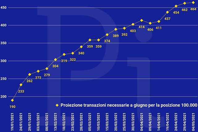 I dati di oggi, martedì 4 maggio, ci dicono che sono necessarie almeno 318 spese per rientrare nell’ultimo degli slot disponibili. È la soglia minima per poter sperare di ambire al bonus extra previsto dal programma. Nel grafico qui sotto la variazione registrata da gennaio a oggi.