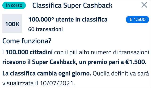 Quante transazioni serviranno per incassare il Super Cashback da 1.500 euro? Come ormai ben noto il bonus extra previsto dall’iniziativa Cashback di Stato sarà assegnato a coloro che a fine giugno si posizioneranno nelle prime 100.000 posizioni della classifica per numero di pagamenti validi eseguiti. Il conteggio considera le spese effettuate nei negozi con uno dei metodi di pagamento supportati: dalle carte di credito a quelle di debito, dai bancomat alle applicazioni mobile compatibili.