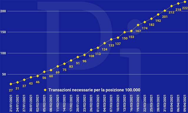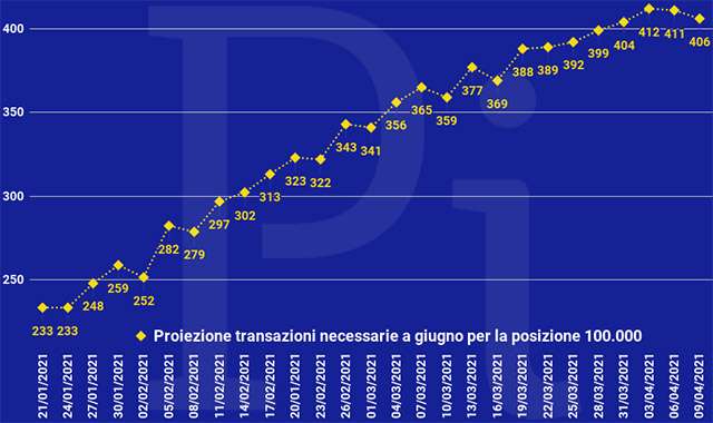 [Update, 09/04/2021, 18.07] Il conteggio è stato aggiornato con un po’ di ritardo rispetto al solito e ora riporta 227 transazioni necessarie (non 222 come al momento della pubblicazione). La soglia delle spese quotidiane sale dunque a 2,29 e quelle semestrali a 415.