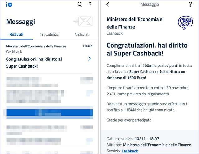 I partecipanti al Cashback di Stato che hanno diritto al Super Cashback da 1.500 euro ne stanno ricevendo in queste ore la conferma. L’applicazione IO mostra il messaggio inoltrato dal Ministero dell’Economia e delle Finanze intitolato Congratulazioni, hai diritto al Super Cashback!