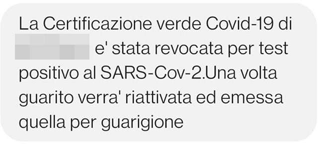In discussione anche le modalità di riattivazione del Green Pass in seguito alla revoca temporanea per positività a COVID-19. Al momento, lo stop viene notificato al cittadino con un messaggio come quello mostrato qui sotto (talvolta ricevuto giorni dopo l’esecuzione di un tampone con esito positivo), con lo sblocco autorizzato poi solo dal doppio intervento della struttura sanitaria che ha eseguito il tampone negativo e del medico di base che ne ha ricevuto l’esito dal paziente. In futuro la procedura sarà velocizzata: revoca immediata con tampone positivo, riattivazione immediata con tampone negativo.