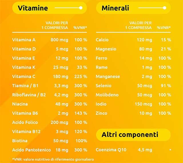 Include le vitamine dei gruppi A, B, C, D, E e K, minerali e coenzima Q10 per rifornire le cellule di energia. Qui sotto il contenuto di ogni compressa, per ulteriori informazioni far riferimento alla scheda completa del prodotto.