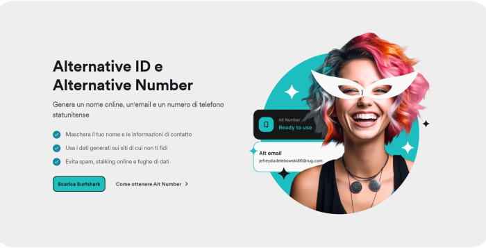 Surfshark Alternative ID, incluso nel pacchetto Starter del servizio Surfshark, offre la possibilità di creare identità virtuali alternative, così da non dover mai condividere i propri dati reali quando ci si registra a portali o servizi online. L’abbonamento costa soltanto 3,19 € al mese grazie a uno sconto del 79%, con tre mesi aggiuntivi gratuiti e la garanzia di rimborso entro 30 giorni.