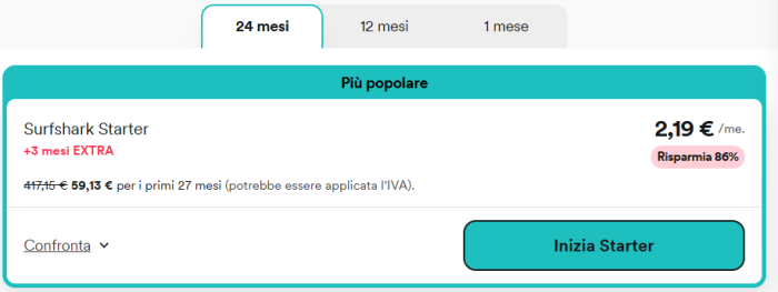 Con Surfshark non proteggi solo i tuoi dispositivi: grazie alla VPN integrata, puoi accedere in sicurezza alle tue piattaforme di streaming preferite, anche quando sei collegato a reti pubbliche. Che tu sia a casa, in viaggio o semplicemente in pausa, potrai continuare a goderti i tuoi film e le tue serie tv senza interruzioni e con la certezza che i tuoi dati restino al sicuro. Con soli 2,19€ al mese hai accesso a una suite di strumenti avanzati che ti permettono di navigare, lavorare e condividere file in tutta tranquillità. E se vuoi provarlo senza impegno, c’è la garanzia soddisfatti o rimborsati di 30 giorni. I punti di forza di Surfshark Antivirus:
