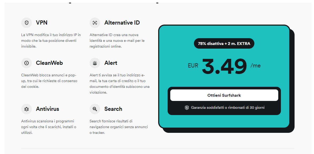 Perché accontentarti di soluzioni parziali quando puoi avere il bundle completo? A soli 3,49 euro al mese, Surfshark One ti offre protezione totale. Lo sconto del 78% sul costo annuale rende lo rende completamente accessibile.