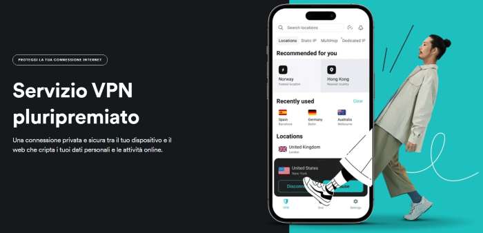Una VPN come quella di Surfshark è utile anche mentre si è in viaggio all’estero, perché grazie alla possibilità di scegliere liberamente la nazionalità dell’indirizzo IP con cui ci si collega a Internet, è possibile accedere ai servizi streaming a cui si è abbonati come se ci si trovasse a casa. Surfshark VPN implementa inoltre una serie di funzionalità avanzate come CleanWeb, Kill Switch, IP a rotazione, Dynamic MultiHop e Bypasser.