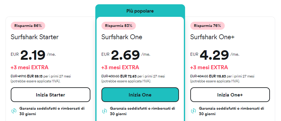 Oltre al pacchetto Starter a 2,19 euro al mese, puoi anche abbonarti a due soluzioni più complete, che contengono anche l’antivirus e altri servizi di protezione: Surfshark One e One+. Con gli sconti rispettivamente dell’83% e del 76%, l’abbonamento biennale di costa 2,69 euro e 4,29 euro.