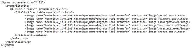 Sysmon può ora bloccare la scrittura su disco di file eseguibili (EXE, DLL, SYS) in base a determinati criteri. È sufficiente creare un file di configurazione per indicare cosa deve essere monitorato e bloccato. L’utente può, ad esempio, bloccare la scrittura di file .exe in specifiche directory. Per impedire alle applicazioni Office di scrivere su disco gli eseguibili dei malware scaricati tramite macro è possibile usare la seguente regola nel file msoffice-fileblock.xml: