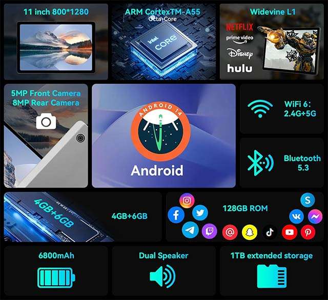 Il display da 11 pollici con risoluzione 1280×800 pixel è al centro dell’esperienza, affiancato da altoparlanti stereo per un coinvolgimento totale. Dal punto di vista delle specifiche tecniche ci sono poi un processore octa core affiancato da 10 gB di RAM (4+6 GB virtuali), da 128 GB di memoria interna per l’archiviazione (espandibile con microSD fino a 1 TB), dalla connettività Wi-Fi 6 e Bluetooth, senza dimenticare le fotocamere da 8 e 5 megapixel posizionate dietro e davanti. Inoltre, la batteria da 6.800 mAh assicura un’autonomia elevata. Per il download di applicazioni e giochi è possibile fare affidamento sulla piattaforma Google Play. Dai un’occhiata alla descrizione completa del dispositivo per conoscere tutti gli altri dettagli.