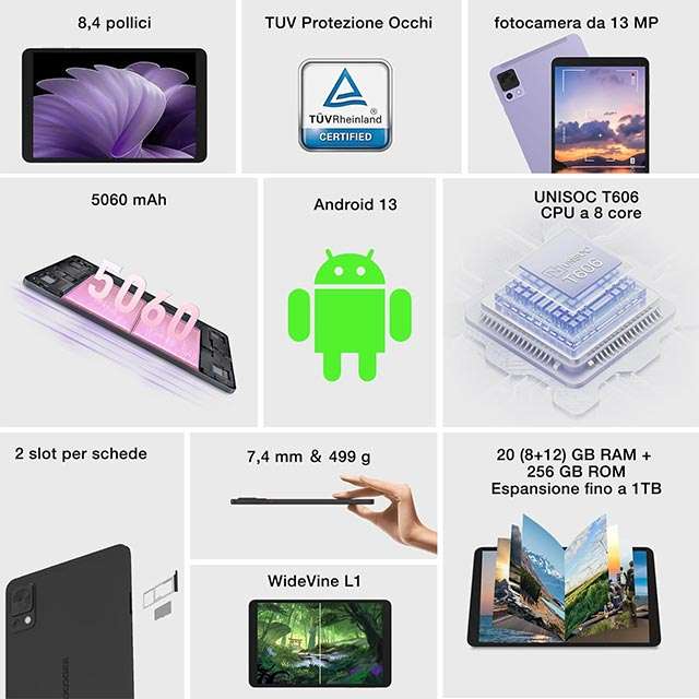 Tra le specifiche tecniche spiccano il display da 8,4 pollici con risoluzione 1920×1200 pixel, il processore octa core Unisoc T606, ben 20 GB di RAM in totale (8+12 GB), i 256 GB di memoria interna espandibile con microSD fino a 1 TB, i moduli Wi-Fi dual band e Bluetooth per la connettività wireless, il supporto Dual SIM per la navigazione in mobilità su reti 4G-LTE, le fotocamere posteriore da 13 megapixel e anteriore da 5 megapixel e la batteria da 5.060 mAh per un’autonomia elevata. Il tutto è racchiuso in uno spessore di soli 7,4 millimetri e con un peso di 499 grammi. Per tutti gli altri dettagli, consultare la descrizione completa del prodotto.