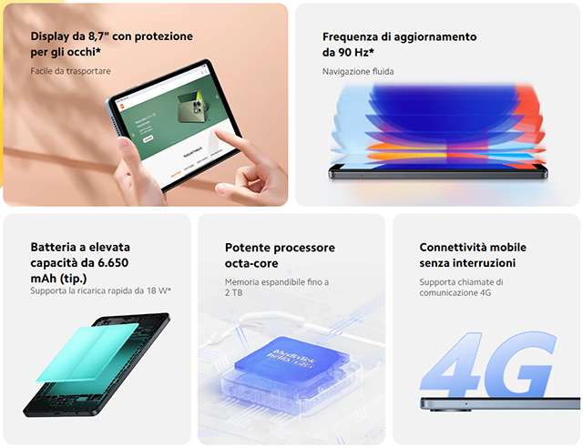 Il sistema operativo è Android con interfaccia MIUI e accesso a Google Play per scaricare le applicazioni. Tra le specifiche tecniche ci sono il display da 8,7 pollici con risoluzione 1340×800 pixel e frequenza di aggiornamento da 90 Hz, il processore MediaTek Helio G85, 4 GB di RAM, 64 GB di memoria interna (espandibile con microSD fino a 1 TB), la fotocamera posteriore da 8 megapixel, quella frontale da 5 megapixel e la batteria da 6.650 mAh con autonomia elevata (ricarica rapida da 18 W tramite USB-C). La connettività è affidata ai moduli 4G, Wi-Fi dual band e Bluetooth 5.3. Dai uno sguardo alla scheda del prodotto per tutti gli altri dettagli.