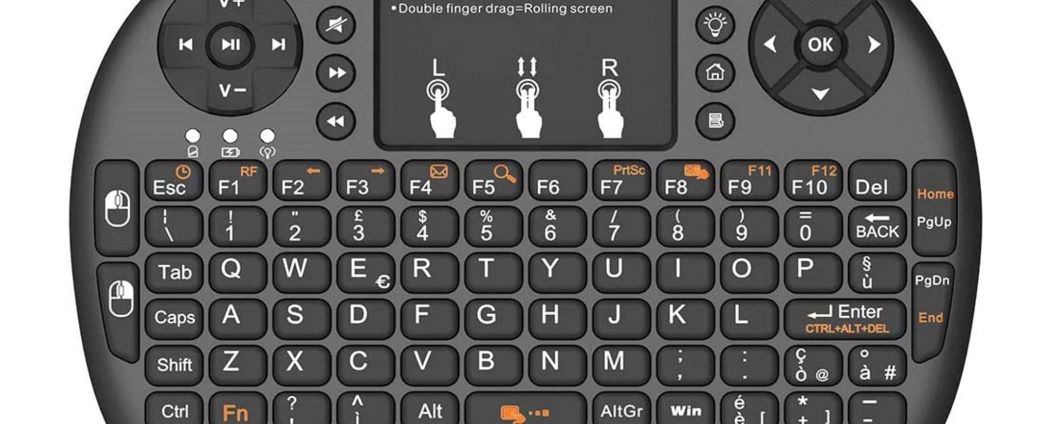 Partiamo dal design, uno degli aspetti più interessanti di questa tastiera. Le dimensioni sono estremamente ridotte, tuttavia ritroviamo un layout completo. La disposizione dei tasti è la qwerty italiana, il che vuol dire che sono presenti tutti i caratteri speciali posizionati per fornire un accesso facilitato. Nella parte alta invece troviamo tutti i comandi supplementari. È presente un trackpad per la gestione del cursore, che attraverso le gesture permette anche di effettuare il clic destro e sinistro. Non mancano comunque due tasti dedicati ai clic. Ai lati del trackpad troviamo invece tutti i pulsanti multimediali dedicati, decisamente utili per l’utilizzo tanto su PC quanto su smart TV. Infine sul lato destro è presente un comodo pad direzionale per navigare con estrema facilità all’interno dei menù o delle applicazioni.