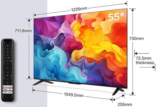 Le funzionalità smart si basano sulla piattaforma Google TV, a partire da quelle per lo streaming dei contenuti da piattaforme come Netflix, Prime Video, YouTube, DAZN, RaiPlay, Disney+ e così via. Tra i punti di forza va sicuramente citato il design senza bordi, elegante e minimalista. Ci sono poi il supporto al Dolby Audio, all’HDR e una modalità dedicata al gaming. Per tutti gli altri dettagli rimandiamo alla scheda completa. L’immagine qui sotto mostra il telecomando in dotazione e le dimensioni del televisore.