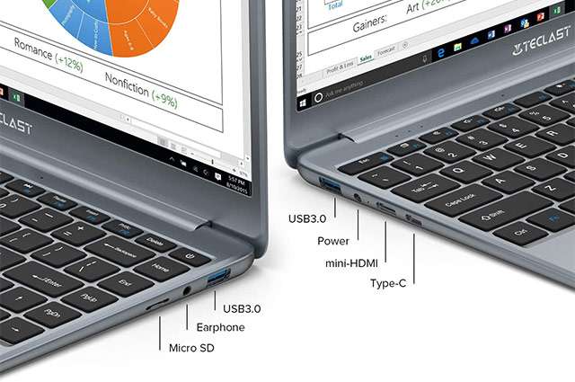 Tra le specifiche tecniche il display da 14 pollici con risoluzione Full HD (1920×1080 pixel), processore Intel Celeron N4100 affiancato dalla GPU Intel HD Graphic 600, 8 GB di RAM, SSD da 256 GB per lo storage, WiFi, Bluetooth, porte USB 3.0 e USB-C, slot microSD, webcam con microfono integrato, jack audio, tastiera con cornice stretta, ampio touchpad e batteria da 38 Wh. Per ulteriori dettagli consultare la scheda del prodotto.