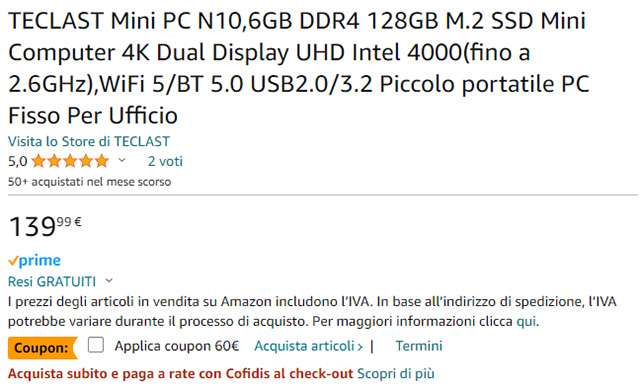 Al prezzo finale di soli 79 euro, il Mini PC di Teclast (modello N10) è un affare da cogliere al volo. Devi solo attivare il coupon dedicato per sbloccare lo sconto di 60 euro, poi metterlo nel carrello.