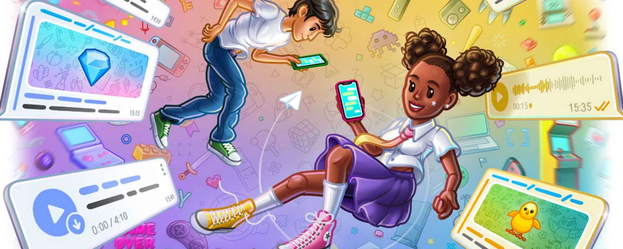 Le successive due novità rendono invece più colorata e divertente l’esperienza d’uso di Telegram. Sono stati aggiunti 8 temi per le chat private che permettono di scegliere lo sfondo animato, il colore delle bolle dei messaggi e il motivo dello sfondo. Ogni tema è disponibile in versione diurna e notturna.