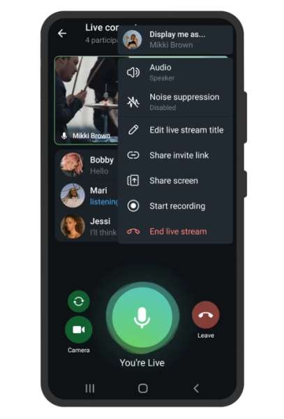 Le dirette streaming sono l’evoluzione delle videochiamate di gruppo introdotte a fine giugno. Telegram permette di creare eventi dal vivo, come un concerto o una lezione di matematica, per un numero illimitato di persone. Gli amministratori dei gruppi o dei canali possono ora registrare le dirette streaming (nei canali) o le chat video (nei gruppi) e condividerle in modo da consentirne la visione agli utenti che hanno perso il live.