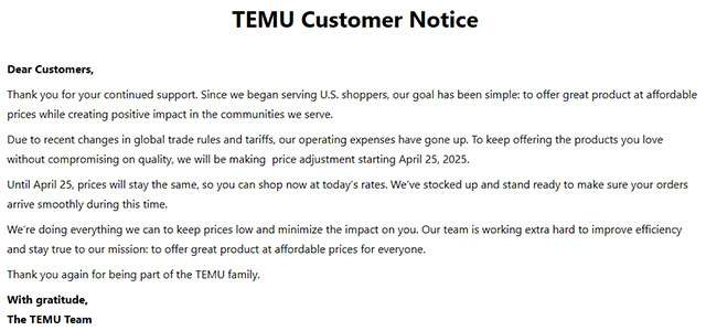 SHEIN ha condiviso un messaggio del tutto simile. Per entrambe gli e-commerce cinesi l’esigenza è la stessa: far fronte all’improvviso incremento delle spese operative dovute alle esportazioni negli USA.