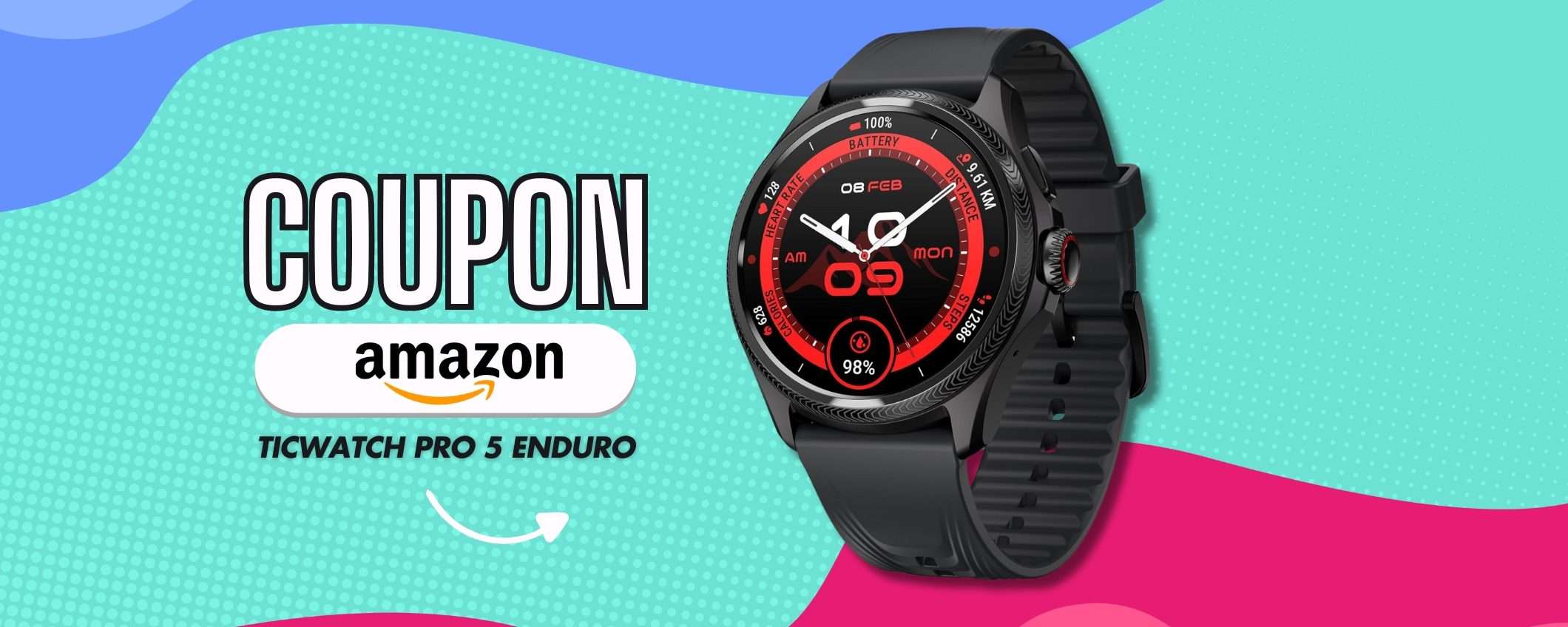 TicWatch Pro 5 Endurolo acquisti a 179€ su Amazon con il coupon che spunti in pagina. Collegati e non perdere tempo.