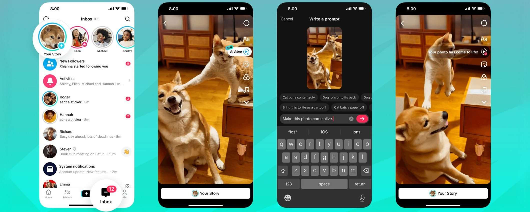 Per creare un video AI Alive, basta aprire la Story Camera e toccare il pulsante blu “+” in alto nella pagina Inbox o Profilo. Da lì, si può scegliere una foto dall’Album delle Storie. L’icona AI Alive apparirà sulla barra degli strumenti laterale destra nella pagina di modifica della foto. Su TikTok esiste già un generatore di immagini AI basato su testo, e anche Instagram e Snapchat oramai offrono le stesse funzioni. Ma la piattaforma cinese è sempre un passo avanti.