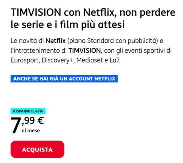 L’offerta TIMVISION con Netflix per i clienti TIM di rete fissa include il pacchetto TIMVISION del valore di 6,99 euro al mese e il piano Standard con pubblicità di Netflix da 6,99 euro al mese. Al momento è in promozione a 7,99 euro al mese per un anno.