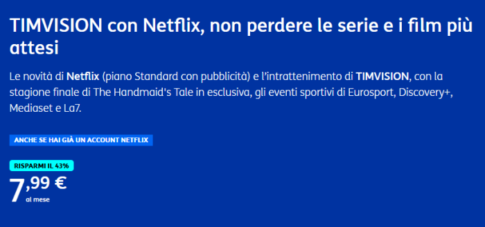 Un’offerta imperdibile anche per chi possiede già un account Netflix e soprattutto per chi non vuole lasciarsi sfuggire nessuna ultima uscita, per gli amanti del cinema e in generale per chi adora trascorrere le proprie serate a fare zapping fra una serie TV cult e una novità assoluta. Con questo bundle risparmi sensibilmente rispetto a un pagamento dei servizi separati, e volendo puoi aggiungere in futuro anche Apple TV+ a prezzo scontato o i piani di Netflix senza la pubblicità, con una piccola differenza. Sfrutta subito la promozione in corso per TIMVISION e Netflix e scopri sul sito le caratteristiche di questo piano esclusivo, disponibile ancora per poco.