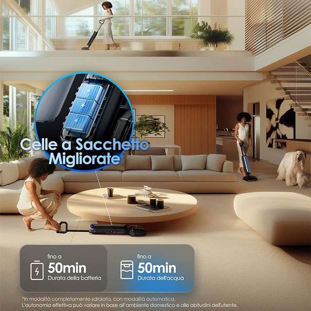 Si distingue per il design ispirato all’aurora boreale, che unisce tonalità celesti e colori vivaci. Il look però non è tutto: grazie alla potente aspirazione da 22 kPa e a una batteria che garantisce fino a 50 minuti di autonomia, assicura una pulizia profonda e continua, senza interruzioni. Il corpo è ultra sottile con design Lay-Flat a 180 gradi e spessore di soli 12,85 cm, per raggiungere facilmente gli spazi sotto letti, divani e mobili bassi. Ancora, il sistema di autopulizia FlashDry utilizza acqua calda per sciogliere le macchie lungo tutto il tubo, fino al rullo, seguito da un’asciugatura a 85 °C per mantenere l’interno sempre igienico. Infine, l’antigroviglio DualBlock combina un pettine che cattura efficacemente i peli e un raschietto lineare che rimuove l’acqua sporca, evitando ostruzioni e mantenendo il dispositivo sempre efficiente. Fai un salto su Amazon per scoprire tutti gli altri dettagli a proposito della scheda tecniche, delle specifiche e delle sua capacità.