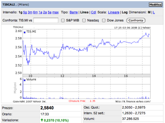 Una giornata chiusa con un lusinghiero +10,10 per cento . È questo il risultato alla Borsa di Milano dell’indiscrezione apparsa stamani su Milano Finanza , relativa ad una trattativa di acquisizione di Tiscali da parte di Vodafone.